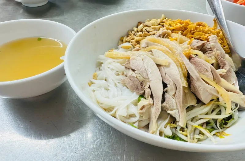 이곳의 닭고기 육수는 정말 특별합니다. 통닭을 우린 육수는 소고기 육수와는 전혀 다른 깔끔하고 시원한 맛을 자랑합니다. 부드럽게 찢어진 닭고기는 입에서 살살 녹으며 쌀면과 함께 먹으면 담백하면서도 깊은 맛을 느낄 수 있습니다. 현지 직장인들이 점심시간마다 줄을 서서 먹을 정도로 인기가 높으며 한국인 관광객들에게도 "닭고기 쌀국수에 대한 편견을 깨트린 곳"이라는 평을 받고 있습니다.